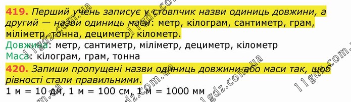 Перший учень записує у стовпчик назви одиниць довжини, а другий — назви одиниць маси: метр, кілограм, сантиметр, грам, міліметр, тонна, дециметр, кілометр. Довжина: метр, сантиметр, міліметр, дециметр, кілометр Маса: кілограм, грам, тонна 420. Запиши пропущені назви одиниць довжини або маси так, щоб рівності стали правильними. 1 м = 10 дм, 1 м = 100 см, 1 м = 1000 мм