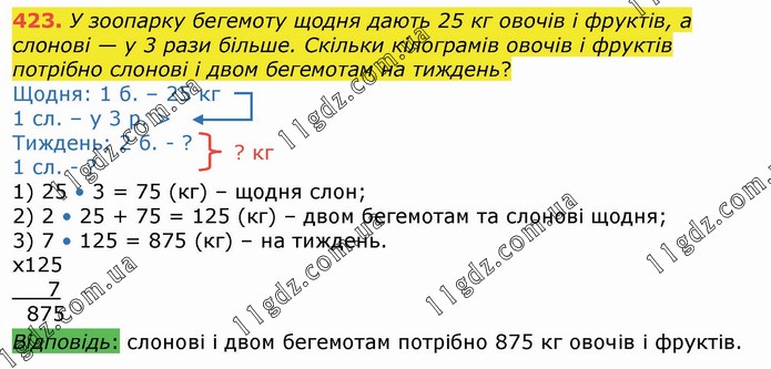 У зоопарку бегемоту щодня дають 25 кг овочів і фруктів, а слонові — у 3 рази більше. Скільки кілограмів овочів і фруктів потрібно слонові і двом бегемотам на тиждень? Щодня: 1 б. – 25 кг 1 сл. – у 3 р. > Тиждень: 2 б. - ? 1 сл. - ? 1) 25 • 3 = 75 (кг) – щодня слон; 2) 2 • 25 + 75 = 125 (кг) – двом бегемотам та слонові щодня; 3) 7 • 125 = 875 (кг) – на тиждень.