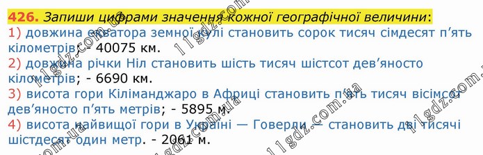 Запиши цифрами значення кожної географічної величини: 1) довжина екватора земної кулі становить сорок тисяч сімдесят п’ять кілометрів; - 40075 км. 2) довжина річки Ніл становить шість тисяч шістсот дев’яносто кілометрів; - 6690 км. 3) висота гори Кіліманджаро в Африці становить п’ять тисяч вісімсот дев’яносто п’ять метрів; - 5895 м. 4) висота найвищої гори в Україні — Говерли — становить дві тисячі шістдесят один метр. - 2061 м.