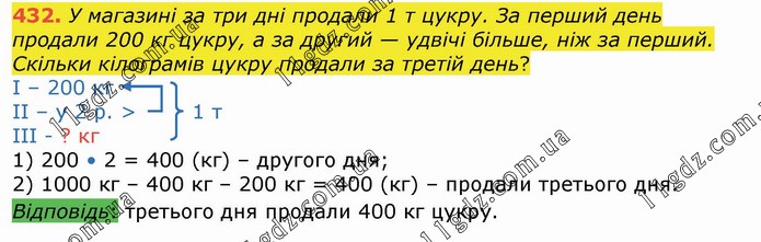 У магазині за три дні продали 1 т цукру. За перший день продали 200 кг цукру, а за другий — удвічі більше, ніж за перший. Скільки кілограмів цукру продали за третій день? І – 200 кг ІІ – у 2 р. > 1 т ІІІ - ? кг 1) 200 • 2 = 400 (кг) – другого дня; 2) 1000 кг – 400 кг – 200 кг = 400 (кг) – продали третього дня. Відповідь: третього дня продали 400 кг цукру.