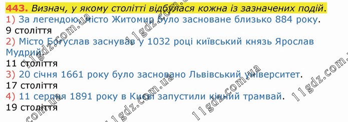 Визнач, у якому столітті відбулася кожна із зазначених подій. 1) За легендою, місто Житомир було засноване близько 884 року. 9 століття 2) Місто Богуслав заснував у 1032 році київський князь Ярослав Мудрий. 11 століття 3) 20 січня 1661 року було засновано Львівський університет. 17 століття 4) 11 серпня 1891 року в Києві запустили кінний трамвай. 19 століття