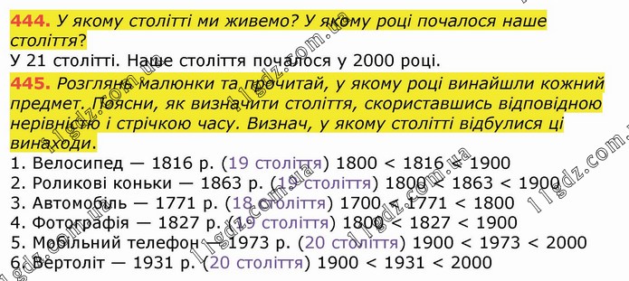 У якому столітті ми живемо? У якому році почалося наше століття? У 21 столітті. Наше століття почалося у 2000 році. 445. Розглянь малюнки та прочитай, у якому році винайшли кожний предмет. Поясни, як визначити століття, скориставшись відповідною нерівністю і стрічкою часу. Визнач, у якому столітті відбулися ці винаходи. 1. Велосипед — 1816 р. (19 століття) 1800 < 1816 < 1900 2. Роликові коньки — 1863 р. (19 століття) 1800 < 1863 < 1900 3. Автомобіль — 1771 р. (18 століття) 1700 < 1771 < 1800 4. Фотографія — 1827 р. (19 століття) 1800 < 1827 < 1900 5. Мобільний телефон — 1973 р. (20 століття) 1900 < 1973 < 2000 6. Вертоліт — 1931 р. (20 століття) 1900 < 1931 < 2000