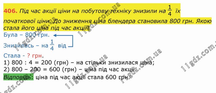 Під час акції ціни на побутову техніку знизили на 1/4 їх початкової ціни. До зниження ціна блендера становила 800 грн. Якою стала його ціна під час акції? Була – 800 грн. Знизилась – на 14 від Стала - ? грн. 1) 800 : 4 = 200 (грн) – на стільки знизилася ціна; 2) 800 – 200 = 600 (грн) – ціна під час акції. Відповідь: ціна під час акції стала 600 грн.