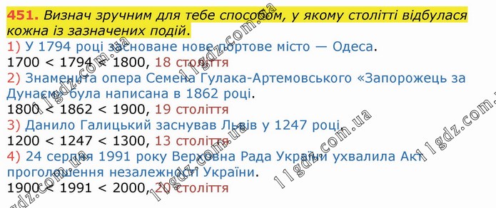 Визнач зручним для тебе способом, у якому столітті відбулася кожна із зазначених подій. 1) У 1794 році засноване нове портове місто — Одеса. 1700 < 1794 < 1800, 18 століття 2) Знаменита опера Семена Гулака-Артемовського «Запорожець за Дунаєм» була написана в 1862 році. 1800 < 1862 < 1900, 19 століття 3) Данило Галицький заснував Львів у 1247 році. 1200 < 1247 < 1300, 13 століття 4) 24 серпня 1991 року Верховна Рада України ухвалила Акт проголошення незалежності України. 1900 < 1991 < 2000, 20 століття