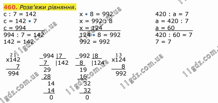 Розв’яжи рівняння. с : 7 = 142 с = 142 • 7 с = 994_____ 994 : 7 = 142 142 = 142 х • 8 = 992 х = 992 : 8 х = 124_____ 124 • 8 = 992 992 = 992 420 : а = 7 а = 420 : 7 а = 60_____ 420 : 60 = 7 7 = 7