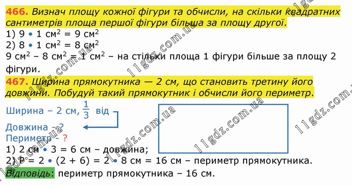 Визнач площу кожної фігури та обчисли, на скільки квадратних сантиметрів площа першої фігури більша за площу другої. 1) 9 • 1 см2 = 9 см2 2) 8 • 1 см2 = 8 см2 9 см2 – 8 см2 = 1 см2 – на стільки площа 1 фігури більше за площу 2 фігури. 467. Ширина прямокутника — 2 см, що становить третину його довжини. Побудуй такий прямокутник і обчисли його периметр.