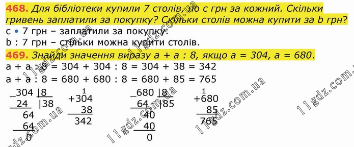 Для бібліотеки купили 7 столів, по c грн за кожний. Скільки гривень заплатили за покупку? Скільки столів можна купити за b грн? с • 7 грн – заплатили за покупку. b : 7 грн – стільки можна купити столів. 469. Знайди значення виразу a + a : 8, якщо a = 304, a = 680. а + а : 8 = 304 + 304 : 8 = 304 + 38 = 342 а + а : 8 = 680 + 680 : 8 = 680 + 85 = 765