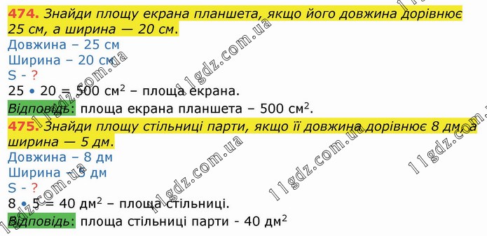 Знайди площу екрана планшета, якщо його довжина дорівнює 25 см, а ширина — 20 см. Довжина – 25 см Ширина – 20 см S - ? 25 • 20 = 500 см2 – площа екрана. Відповідь: площа екрана планшета – 500 см2. 475. Знайди площу стільниці парти, якщо її довжина дорівнює 8 дм, а ширина — 5 дм. Довжина – 8 дм Ширина – 5 дм S - ? 8 • 5 = 40 дм2 – площа стільниці. Відповідь: площа стільниці парти - 40 дм2
