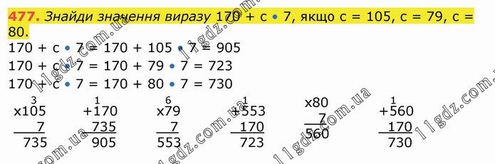 Знайди значення виразу 170 + с • 7, якщо с = 105, с = 79, с = 80. 170 + с • 7 = 170 + 105 • 7 = 905 170 + с • 7 = 170 + 79 • 7 = 723 170 + с • 7 = 170 + 80 • 7 = 730