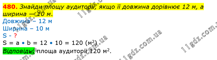 Знайди площу аудиторії, якщо її довжина дорівнює 12 м, а ширина — 10 м. Довжина – 12 м Ширина – 10 м S - ? 12 • 10 = 120 (м2) – площа. Відповідь: площа аудиторії 120 м2.