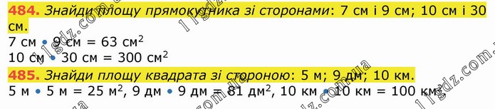 Знайди площу прямокутника зі сторонами: 7 см і 9 см; 10 см і 30 см. 7 см • 9 см = 63 см2 10 см • 30 см = 300 см2 485. Знайди площу квадрата зі стороною: 5 м; 9 дм; 10 км. 5 м • 5 м = 25 м2, 9 дм • 9 дм = 81 дм2, 10 км • 10 км = 100 км2.
