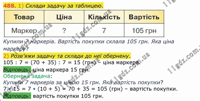 Купили 7 маркерів. Вартість покупки склала 105 грн. Яка ціна маркеру? 2) Розв’яжи задачу та склади до неї обернену. 105 : 7 = (70 + 35) : 7 = 15 (грн) – ціна маркера. Відповідь: ціна маркера 15 грн. Обернена задача: Купили 7 маркерів за ціною 15 грн. Яка вартість покупки? 7 • 15 = 7 • (10 + 5) = 70 + 35 = 105 (грн) – вартість покупки. Відповідь: вартість покупки 105 грн.
