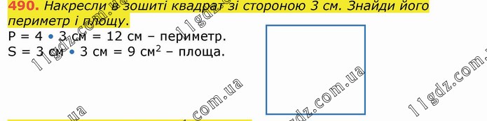 Накресли в зошиті квадрат зі стороною 3 см. Знайди його периметр і площу. Р = 4 • 3 см = 12 см – периметр. S = 3 см • 3 см = 9 см2 – площа.
