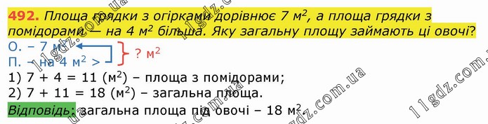 Площа грядки з огірками дорівнює 7 м2, а площа грядки з помідорами — на 4 м2 більша. Яку загальну площу займають ці овочі? О. – 7 м2 П. – на 4 м2 > 1) 7 + 4 = 11 (м2) – площа з помідорами; 2) 7 + 11 = 18 (м2) – загальна площа. Відповідь: загальна площа під овочі – 18 м2.
