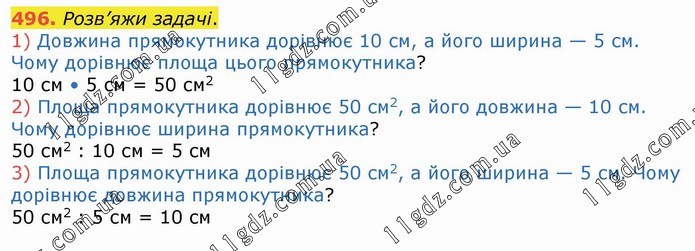 Розв’яжи задачі. 1) Довжина прямокутника дорівнює 10 см, а його ширина — 5 см. Чому дорівнює площа цього прямокутника? 10 см • 5 см = 50 см2 2) Площа прямокутника дорівнює 50 см2, а його довжина — 10 см. Чому дорівнює ширина прямокутника? 50 см2 : 10 см = 5 см 3) Площа прямокутника дорівнює 50 см2, а його ширина — 5 см. Чому дорівнює довжина прямокутника? 50 см2 : 5 см = 10 см