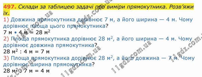 Склади за таблицею задачі про виміри прямокутника. Розв’яжи їх. 1) Довжина прямокутника дорівнює 7 м, а його ширина — 4 м. Чому дорівнює площа цього прямокутника? 7 м • 4 м = 28 м2 2) Площа прямокутника дорівнює 28 м2, а його ширина — 4 м. Чому дорівнює довжина прямокутника? 28 м2 : 4 м = 7 м 3) Площа прямокутника дорівнює 28 м2, а його довжина — 7 м. Чому дорівнює ширина прямокутника? 28 м2 : 7 м = 4 м