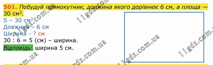 Побудуй прямокутник, довжина якого дорівнює 6 см, а площа — 30 см2. S – 30 см2 Довжина – 6 см Ширина - ? см 30 : 6 = 5 (см) – ширина. Відповідь: ширина 5 см.
