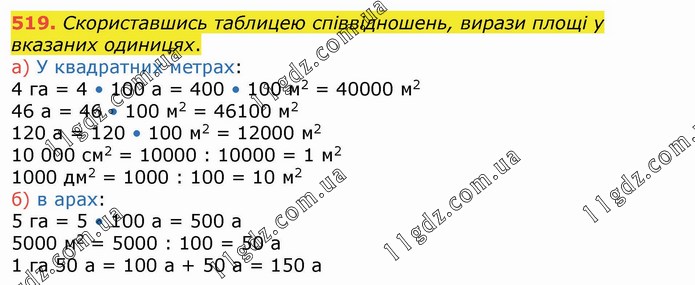 Скориставшись таблицею співвідношень, вирази площі у вказаних одиницях. а) У квадратних метрах: 4 га = 4 • 100 а = 400 • 100 м2 = 40000 м2 46 а = 46 • 100 м2 = 46100 м2 120 а = 120 • 100 м2 = 12000 м2 10 000 см2 = 10000 : 10000 = 1 м2 1000 дм2 = 1000 : 100 = 10 м2 б) в арах: 5 га = 5 • 100 а = 500 а 5000 м2 = 5000 : 100 = 50 а 1 га 50 а = 100 а + 50 а = 150 а