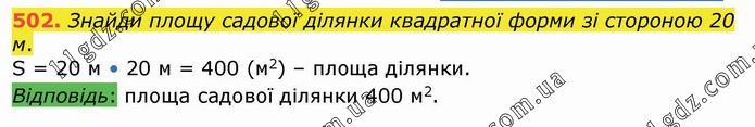 Знайди площу садової ділянки квадратної форми зі стороною 20 м. S = 20 м • 20 м = 400 (м2) – площа ділянки. Відповідь: площа садової ділянки 400 м2.