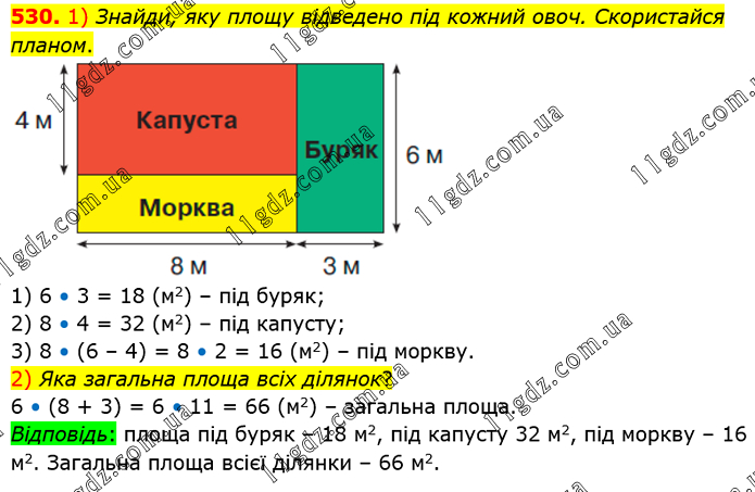 1) Знайди, яку площу відведено під кожний овоч. Скористайся планом. 1) 6 • 3 = 18 (м2) – під буряк; 2) 8 • 4 = 32 (м2) – під капусту; 3) 8 • (6 – 4) = 8 • 2 = 16 (м2) – під моркву. 2) Яка загальна площа всіх ділянок? 6 • (8 + 3) = 6 • 11 = 66 (м2) – загальна площа. Відповідь: площа під буряк – 18 м2, під капусту 32 м2, під моркву – 16 м2. Загальна площа всієї ділянки – 66 м2.