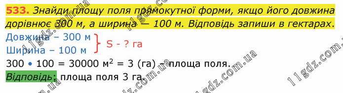 Знайди площу поля прямокутної форми, якщо його довжина дорівнює 300 м, а ширина — 100 м. Відповідь запиши в гектарах. Довжина – 300 м Ширина – 100 м 300 • 100 = 30000 м2 = 3 (га) – площа поля. Відповідь: площа поля 3 га.