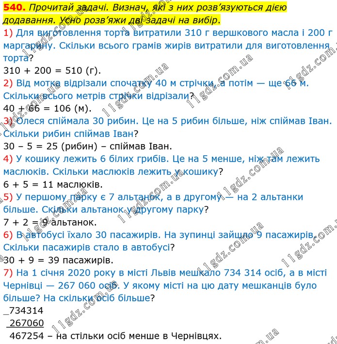Прочитай задачі. Визнач, які з них розв’язуються дією додавання. Усно розв’яжи дві задачі на вибір. 1) Для виготовлення торта витратили 310 г вершкового масла і 200 г маргарину. Скільки всього грамів жирів витратили для виготовлення торта? 310 + 200 = 510 (г). 2) Від мотка відрізали спочатку 40 м стрічки, а потім — ще 66 м. Скільки всього метрів стрічки відрізали? 40 + 66 = 106 (м). 3) Олеся спіймала 30 рибин. Це на 5 рибин більше, ніж спіймав Іван. Скільки рибин спіймав Іван? 30 – 5 = 25 (рибин) – спіймав Іван. 4) У кошику лежить 6 білих грибів. Це на 5 менше, ніж там лежить маслюків. Скільки маслюків лежить у кошику? 6 + 5 = 11 маслюків. 5) У першому парку є 7 альтанок, а в другому — на 2 альтанки більше. Скільки альтанок у другому парку? 7 + 2 = 9 альтанок. 6) В автобусі їхало 30 пасажирів. На зупинці зайшло 9 пасажирів. Скільки пасажирів стало в автобусі? 30 + 9 = 39 пасажирів. 7) На 1 січня 2020 року в місті Львів мешкало 734 314 осіб, а в місті Чернівці — 267 060 осіб. У якому місті на цю дату мешканців було більше? На скільки осіб більше? 467254 – на стільки осіб менше в Чернівцях.