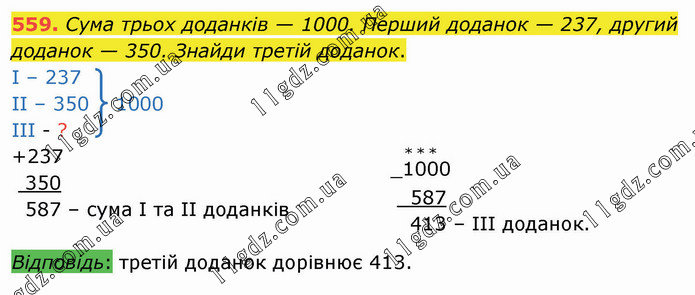 Сума трьох доданків — 1000. Перший доданок — 237, другий доданок — 350. Знайди третій доданок. І – 237 ІІ – 350 1000
