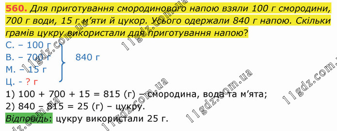 Для приготування смородинового напою взяли 100 г смородини, 700 г води, 15 г м’яти й цукор. Усього одержали 840 г напою. Скільки грамів цукру використали для приготування напою? С. – 100 г В. – 700 г 840 г М. – 15 г Ц. - ? г 1) 100 + 700 + 15 = 815 (г) – смородина, вода та м’ята; 2) 840 – 815 = 25 (г) – цукру. Відповідь: цукру використали 25 г.