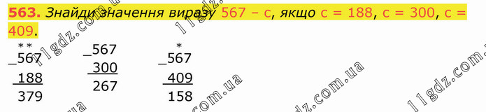 Знайди значення виразу 567 – с, якщо с = 188, с = 300, с = 409.