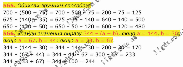 Обчисли зручним способом. 700 – (500 + 75) = 700 – 500 – 75 = 200 – 75 = 125 675 – (140 + 35) = 675 – 35 – 140 = 640 – 140 = 500 650 – (120 + 50) = 650 – 50 – 120 = 600 – 120 = 480 566. Знайди значення виразу 344 – (а + b), якщо а = 144, b = 30; якщо а = 67, b = 44; якщо а = 33, b = 67. 344 – (144 + 30) = 344 – 144 – 30 = 200 – 30 = 170 344 – (67 + 44) = 344 – 44 – 67 = 300 – 67 = 233 344 – (33 + 67) = 344 – 100 = 244