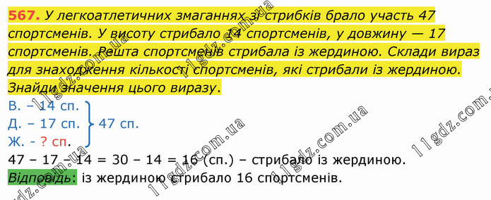 У легкоатлетичних змаганнях зі стрибків брало участь 47 спортсменів. У висоту стрибало 14 спортсменів, у довжину — 17 спортсменів. Решта спортсменів стрибала із жердиною. Склади вираз для знаходження кількості спортсменів, які стрибали із жердиною. Знайди значення цього виразу. В. – 14 сп. Д. – 17 сп. 47 сп. Ж. - ? сп. 47 – 17 – 14 = 30 – 14 = 16 (сп.) – стрибало із жердиною. Відповідь: із жердиною стрибало 16 спортсменів.