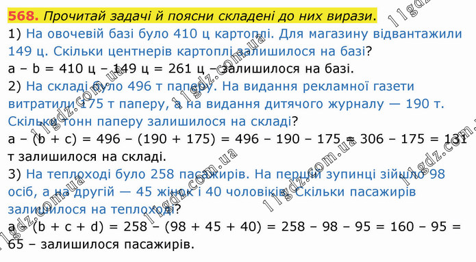 Прочитай задачі й поясни складені до них вирази. 1) На овочевій базі було 410 ц картоплі. Для магазину відвантажили 149 ц. Скільки центнерів картоплі залишилося на базі? а – b = 410 ц – 149 ц = 261 ц – залишилося на базі. 2) На складі було 496 т паперу. На видання рекламної газети витратили 175 т паперу, а на видання дитячого журналу — 190 т. Скільки тонн паперу залишилося на складі? а – (b + с) = 496 – (190 + 175) = 496 – 190 – 175 = 306 – 175 = 131 т залишилося на складі. 3) На теплоході було 258 пасажирів. На першій зупинці зійшло 98 осіб, а на другій — 45 жінок і 40 чоловіків. Скільки пасажирів залишилося на теплоході? а – (b + с + d) = 258 – (98 + 45 + 40) = 258 – 98 – 95 = 160 – 95 = 65 – залишилося пасажирів.