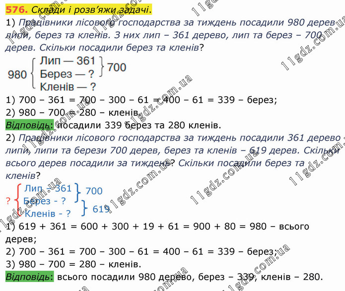 Склади і розв’яжи задачі. 1) Працівники лісового господарства за тиждень посадили 980 дерев липи, берез та кленів. З них лип – 361 дерево, лип та берез – 700 дерев. Скільки посадили берез та кленів? 1) 700 – 361 = 700 – 300 – 61 = 400 – 61 = 339 – берез; 2) 980 – 700 = 280 – кленів. Відповідь: посадили 339 берез та 280 кленів. 2) Працівники лісового господарства за тиждень посадили 361 дерево липи, липи та берези 700 дерев, берез та кленів – 619 дерев. Скільки всього дерев посадили за тиждень? Скільки посадили берез та кленів? Лип – 361 ? Берез - ? Кленів - ? 1) 619 + 361 = 600 + 300 + 19 + 61 = 900 + 80 = 980 – всього дерев; 2) 700 – 361 = 700 – 300 – 61 = 400 – 61 = 339 – берез; 3) 980 – 700 = 280 – кленів. Відповідь: всього посадили 980 дерево, берез – 339, кленів – 280.