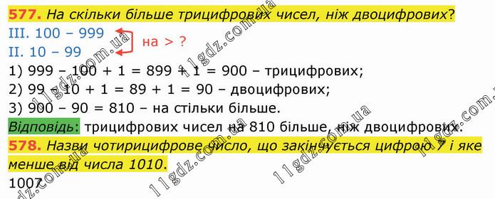 На скільки більше трицифрових чисел, ніж двоцифрових? ІІІ. 100 – 999 ІІ. 10 – 99 1) 999 – 100 + 1 = 899 + 1 = 900 – трицифрових; 2) 99 – 10 + 1 = 89 + 1 = 90 – двоцифрових; 3) 900 – 90 = 810 – на стільки більше. Відповідь: трицифрових чисел на 810 більше, ніж двоцифрових. 578. Назви чотирицифрове число, що закінчується цифрою 7 і яке менше від числа 1010. 1007