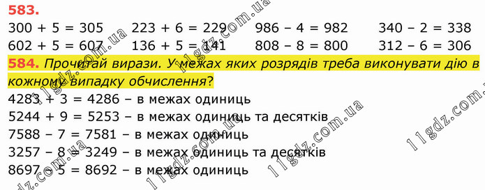 300 + 5 = 305 602 + 5 = 607 223 + 6 = 229 136 + 5 = 141 986 – 4 = 982 808 – 8 = 800 340 – 2 = 338 312 – 6 = 306 584. Прочитай вирази. У межах яких розрядів треба виконувати дію в кожному випадку обчислення? 4283 + 3 = 4286 – в межах одиниць 5244 + 9 = 5253 – в межах одиниць та десятків 7588 – 7 = 7581 – в межах одиниць 3257 – 8 = 3249 – в межах одиниць та десятків 8697 – 5 = 8692 – в межах одиниць