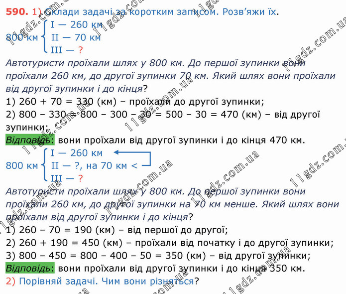 1) Склади задачі за коротким записом. Розв’яжи їх. I — 260 км 800 км II — 70 км III — ? Автотуристи проїхали шлях у 800 км. До першої зупинки вони проїхали 260 км, до другої зупинки 70 км. Який шлях вони проїхали від другої зупинки і до кінця? 1) 260 + 70 = 330 (км) – проїхали до другої зупинки; 2) 800 – 330 = 800 – 300 – 30 = 500 – 30 = 470 (км) – від другої зупинки; Відповідь: вони проїхали від другої зупинки і до кінця 470 км. I — 260 км 800 км II — ?, на 70 км < III — ? Автотуристи проїхали шлях у 800 км. До першої зупинки вони проїхали 260 км, до другої зупинки на 70 км менше. Який шлях вони проїхали від другої зупинки і до кінця? 1) 260 – 70 = 190 (км) – від першої до другої; 2) 260 + 190 = 450 (км) – проїхали від початку і до другої зупинки; 3) 800 – 450 = 800 – 400 – 50 = 350 (км) – від другої зупинки; Відповідь: вони проїхали від другої зупинки і до кінця 350 км. 2) Порівняй задачі. Чим вони різняться?