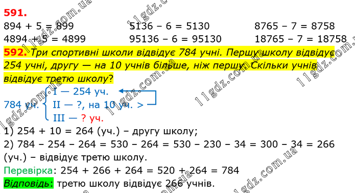 894 + 5 = 899 4894 + 5 = 4899 5136 – 6 = 5130 95136 – 6 = 95130 8765 – 7 = 8758 18765 – 7 = 18758 592. Три спортивні школи відвідує 784 учні. Першу школу відвідує 254 учні, другу — на 10 учнів більше, ніж першу. Скільки учнів відвідує третю школу? I — 254 уч. 784 уч. II — ?, на 10 уч. > III — ? уч. 1) 254 + 10 = 264 (уч.) – другу школу; 2) 784 – 254 – 264 = 530 – 264 = 530 – 230 – 34 = 300 – 34 = 266 (уч.) – відвідує третю школу. Перевірка: 254 + 266 + 264 = 520 + 264 = 784 Відповідь: третю школу відвідує 266 учнів.