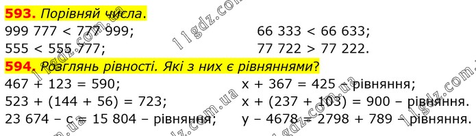 593. Порівняй числа. 999 777 < 777 999; 555 < 555 777; 66 333 < 66 633; 77 722 > 77 222. 594. Розглянь рівності. Які з них є рівняннями? 467 + 123 = 590; 523 + (144 + 56) = 723; 23 674 – с = 15 804 – рівняння; х + 367 = 425 – рівняння; х + (237 + 103) = 900 – рівняння. y – 4678 = 2798 + 789 – рівняння.