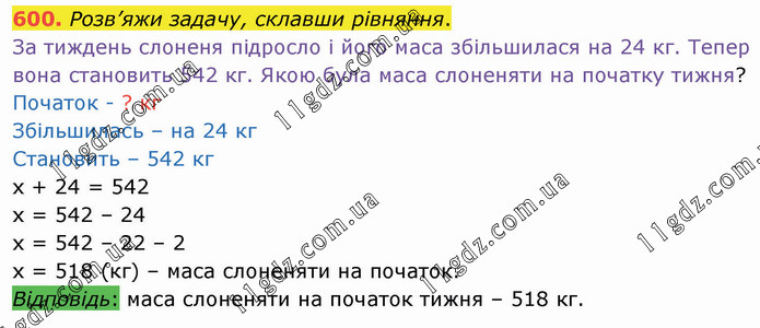 Розв’яжи задачу, склавши рівняння. За тиждень слоненя підросло і його маса збільшилася на 24 кг. Тепер вона становить 542 кг. Якою була маса слоненяти на початку тижня? Початок - ? кг Збільшилась – на 24 кг Становить – 542 кг х + 24 = 542 х = 542 – 24 х = 542 – 22 – 2 х = 518 (кг) – маса слоненяти на початок. Відповідь: маса слоненяти на початок тижня – 518 кг.