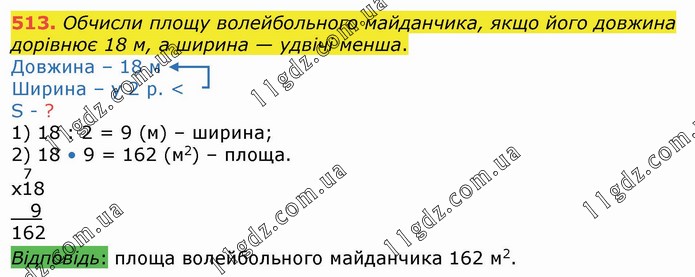 Обчисли площу волейбольного майданчика, якщо його довжина дорівнює 18 м, а ширина — удвічі менша. Довжина – 18 м Ширина – у 2 р. < S - ? 1) 18 : 2 = 9 (м) – ширина; 2) 18 • 9 = 162 (м2) – площа.