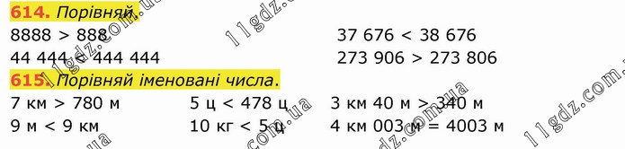 Порівняй. 8888 > 888 44 444 < 444 444 37 676 < 38 676 273 906 > 273 806 615. Порівняй іменовані числа. 7 км > 780 м 9 м < 9 км 5 ц < 478 ц 10 кг < 5 ц 3 км 40 м > 340 м 4 км 003 м = 4003 м