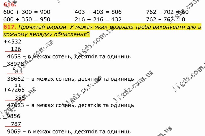 600 + 300 = 900 600 + 350 = 950 403 + 403 = 806 216 + 216 = 432 762 – 702 = 60 762 – 762 = 0 617. Прочитай вирази. У межах яких розрядів треба виконувати дію в кожному випадку обчислення?