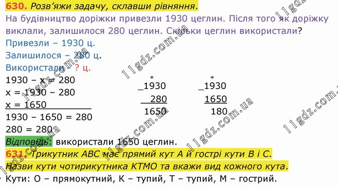 Розв’яжи задачу, склавши рівняння. На будівництво доріжки привезли 1930 цеглин. Після того як доріжку виклали, залишилося 280 цеглин. Скільки цеглин використали? Привезли – 1930 ц. Залишилося – 280 ц. Використали - ? ц. 1930 – х = 280 х = 1930 – 280 х = 1650________ 1930 – 1650 = 280 280 = 280 Трикутник АВС має прямий кут А й гострі кути В і С. Назви кути чотирикутника KТМО та вкажи вид кожного кута. Кути: О – прямокутний, К – тупий, Т – тупий, М – гострий.