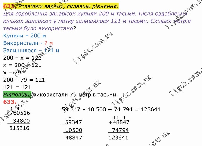 Розв’яжи задачу, склавши рівняння. Для оздоблення занавісок купили 200 м тасьми. Після оздоблення кількох занавісок у мотку залишилося 121 м тасьми. Скільки метрів тасьми було використано? Купили – 200 м Використали - ? м Залишилося – 121 м 200 – х = 121 х = 200 – 121 х = 79_______ 200 – 79 = 121 121 = 121 Відповідь: використали 79 метрів тасьми.