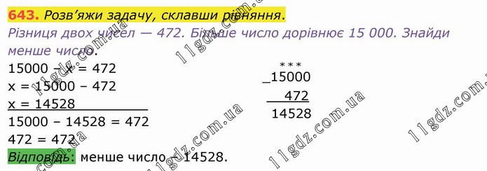 Розв’яжи задачу, склавши рівняння. Різниця двох чисел — 472. Більше число дорівнює 15 000. Знайди менше число. 15000 – х = 472 х = 15000 – 472 х = 14528_________ 15000 – 14528 = 472 472 = 472 _15(*)0(*)0(*)0 472 14528 Відповідь: менше число – 14528.