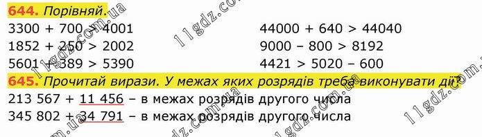 Порівняй. 3300 + 700 > 4001 1852 + 250 > 2002 5601 + 389 > 5390 44000 + 640 > 44040 9000 – 800 > 8192 4421 > 5020 – 600 645. Прочитай вирази. У межах яких розрядів треба виконувати дії? 213 567 + 11 456 – в межах розрядів другого числа 345 802 + 34 791 – в межах розрядів другого числа