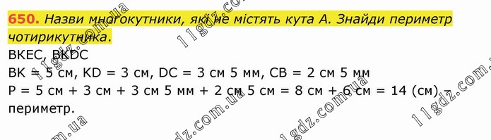 Назви многокутники, які не містять кута А. Знайди периметр чотирикутника. ВКЕС, ВКDC BK = 5 см, KD = 3 см, DC = 3 см 5 мм, CB = 2 см 5 мм Р = 5 см + 3 см + 3 см 5 мм + 2 см 5 см = 8 см + 6 см = 14 (см) – периметр.