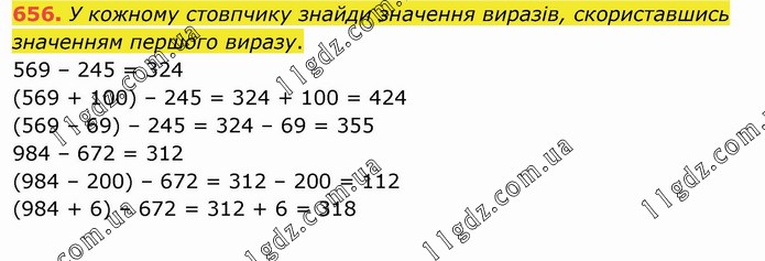 У кожному стовпчику знайди значення виразів, скориставшись значенням першого виразу. 569 – 245 = 324 (569 + 100) – 245 = 324 + 100 = 424 (569 – 69) – 245 = 324 – 69 = 355 984 – 672 = 312 (984 – 200) – 672 = 312 – 200 = 112 (984 + 6) – 672 = 312 + 6 = 318