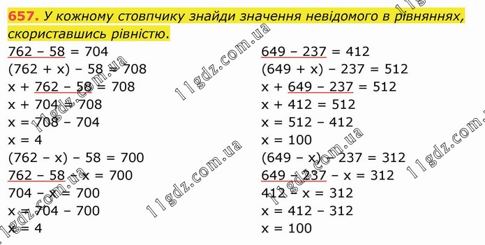 У кожному стовпчику знайди значення невідомого в рівняннях, скориставшись рівністю. 762 – 58 = 704 (762 + х) – 58 = 708 х + 762 – 58 = 708 х + 704 = 708 х = 708 – 704 х = 4 (762 – х) – 58 = 700 762 – 58 – х = 700 704 – х = 700 х = 704 – 700 х = 4 649 – 237 = 412 (649 + х) – 237 = 512 х + 649 – 237 = 512 х + 412 = 512 х = 512 – 412 х = 100 (649 – х) – 237 = 312 649 – 237 – х = 312 412 – х = 312 х = 412 – 312 х = 100
