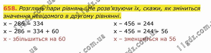Розглянь пари рівнянь. Не розв’язуючи їх, скажи, як зміниться значення невідомого в другому рівнянні. х – 286 = 334 х – 286 = 334 + 60 х - збільшиться на 60 х – 456 = 244 х – 456 = 244 – 56 х – зменшиться на 56
